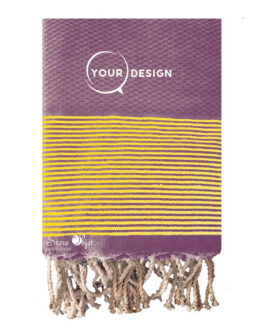 Jeté Fouta Tunisienne tissage au plat avec fil lurex dorét Matière 100% coton Origine: Tunisie Fabrication artisanale Très absorbante et sèche rapidement Finition : franges nouées à la main sur toutes les côtés Couleur chaine et trame : écru Couleur de fond : violet…